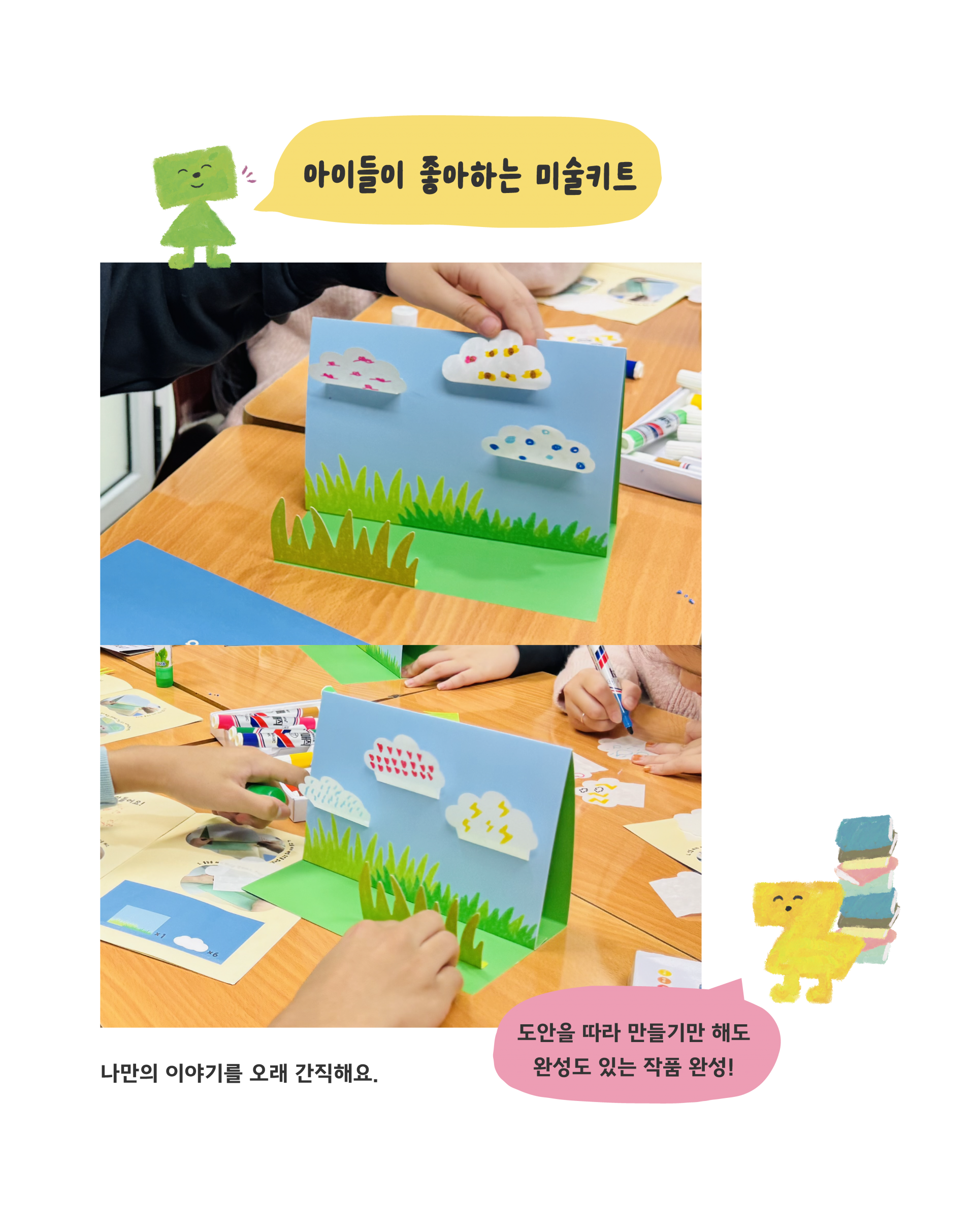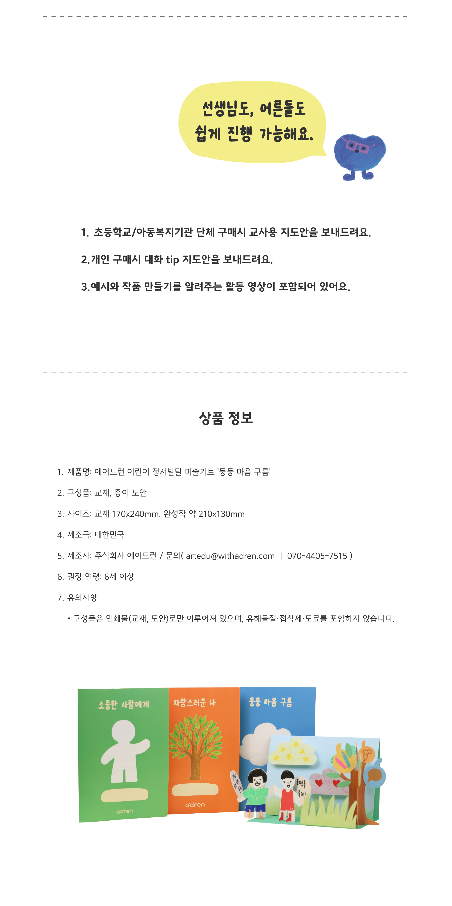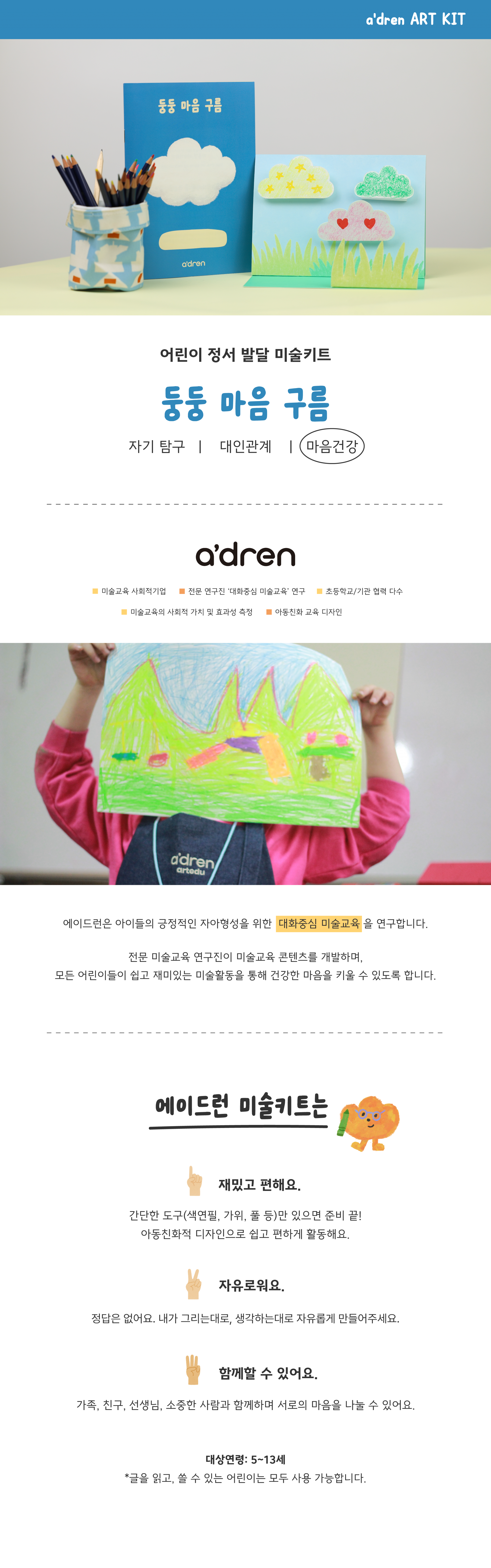 - 에이드런의 '대화중심 미술교육'연구진이 개발한 미술 키트로, 전문 교재와 종이 도안으로 구성되어 있습니다.