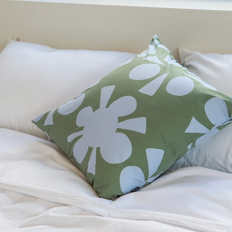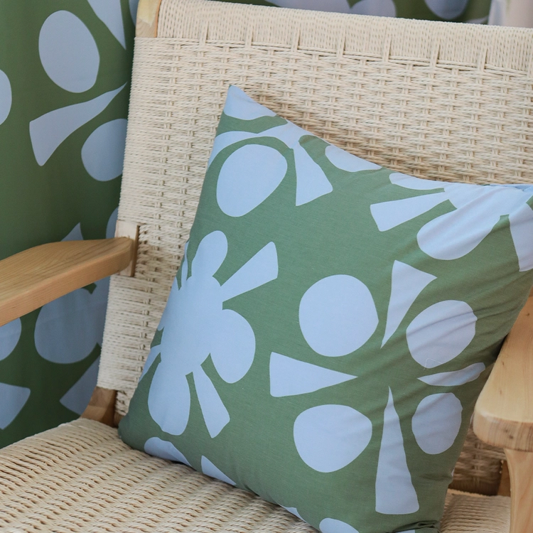 면과 폴리 소재로 제작된 50*50cm의 패턴 쿠션 커버입니다. 아이들에게 영감받아 디자인된 패턴을 인쇄하여 특별한 무드를 담아냈어요.
